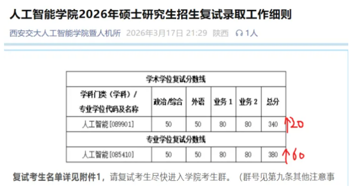 人工智能学硕复试线上调20分,人工智能专硕复试线上调60分。