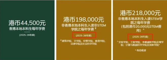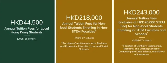 STEM学院:学费为24.3万港币/学年,较去年上涨约11.5%,四年合计97.2万港币,涵盖牙医学院、工程学院、医学院及理学院;计算与数据科学学院和创新学院。