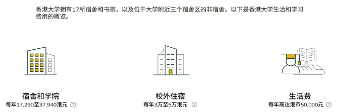 另外,住宿费差距挺大,住宿舍和学院最低17,290港币,而住校外最高5万港元。生活费方面,港大给了一个特定的标准,一年费用高达5万港币。