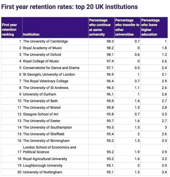 牛津大学位列第三名,圣安德鲁斯、杜伦大学、巴斯大学和布里斯托大学这几所老牌名校,分别位列8-11名;