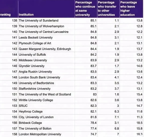 伦敦城市大学以74.7%的通过率妥妥登顶;另外,该校的转学率(7%)和辍学率(18.3%)也很高,或许是学生们顶不住这么高的挂科率,因而直接选择转学或辍学跑路了。