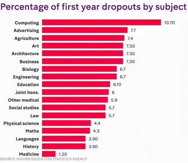 计算机专业是留学的大热门,然而英国大学计算机专业的挂科率高达10.7%,说明计算机专业难度非常大,尤其是跨专业申请的同学,一定要注意自己的学习情况。