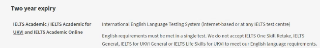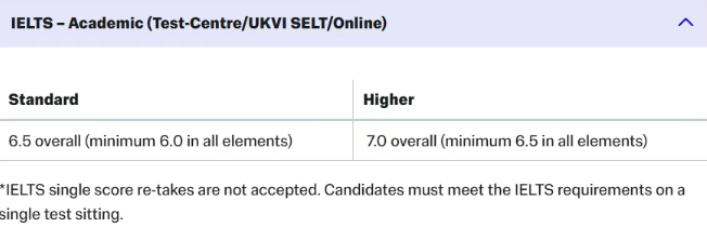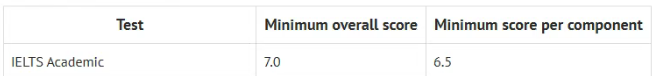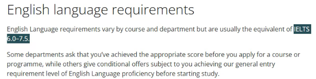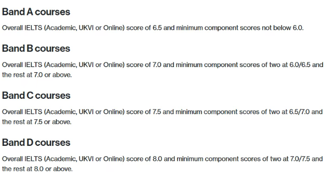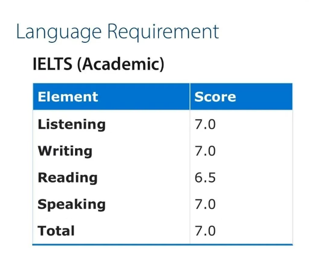 雅思要求:分为两档。Standard:总分6.5(小分不低于6.0);Higher:总分7.0(小分不低于6.5)。