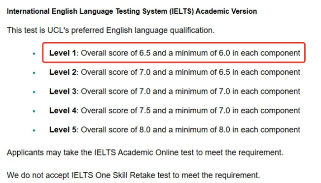 雅思要求:分为五个类别,从level 1到level 5,最低6.5(6.0).