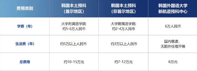 *韩国本土预科及前期准备总费用约7-15万元不等,本预科项目最高可节省9万元,为学生家庭减轻经济压力。