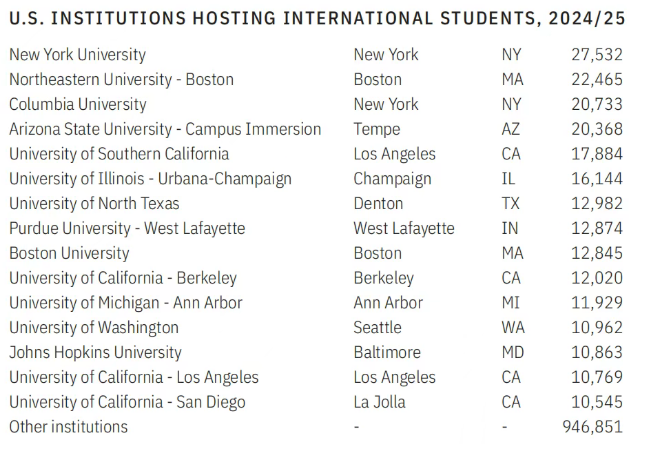 纽约大学继续稳坐榜首,这已经是它连续多年成为最受国际学生欢迎的美国大学,其次是:接下来一起看看2025国际生人数最多的美国大学TOP10!