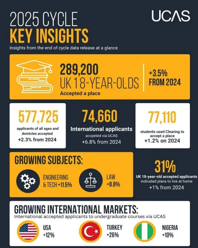 与之相对,大学及学院录取人数同样达到3年来最高,从2024年的564,940人增至2025年的577,725人,增幅2.3%。 其中,来自海外的录取人数再创新高 (74,660人),较2024年的69,905人增长6.8%,达到2021年以来最高值。(注:UCAS数据仅覆盖部分国际本科录取)。