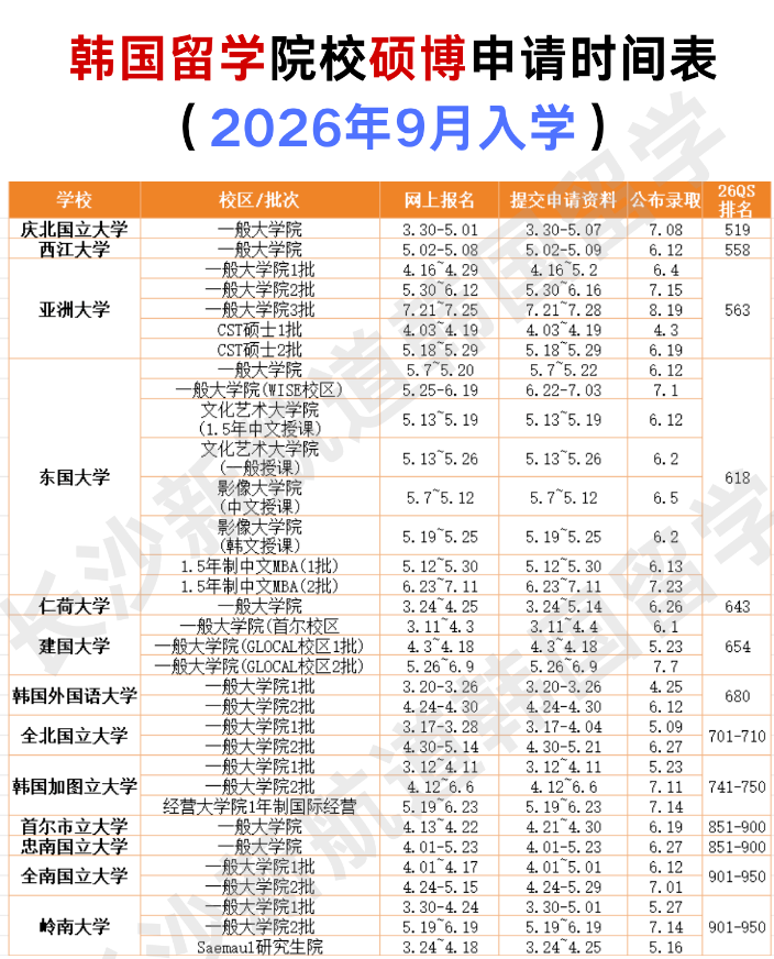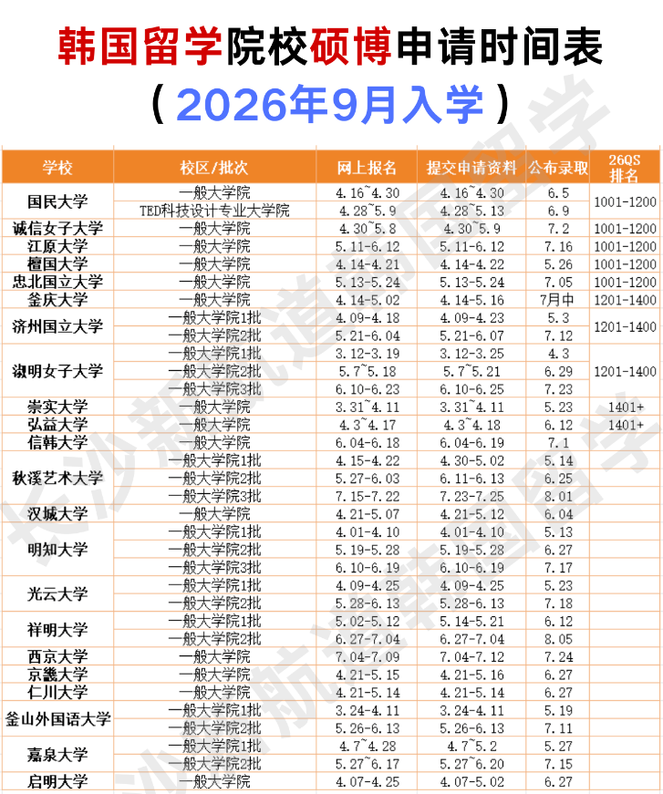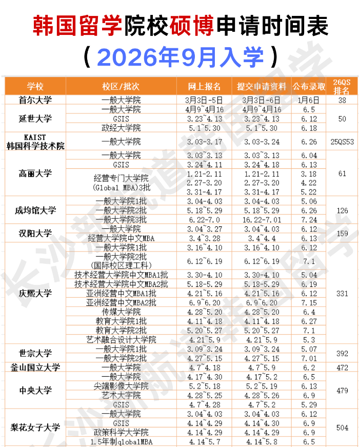 今天长沙留学小编小编就为大家系统梳理一份【2026年9月入学韩国留学硕士博士申请时间表】,建议收藏?