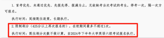 第二类是“限次数刷分”,比如河南大学允许425分以上的学生再报一次,但在校期间总共不能超过1次;