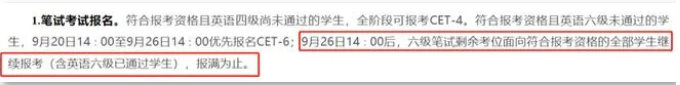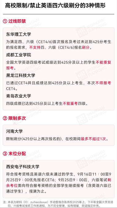 全国考生千千万,但各有各的愁。有人愁的是没到425分还得再考,但对想要取得高分,尤其是有考研保研计划的考生来说,刚刚过线可能比没合格更加“地狱”。由于考位资源有限,不少高校在四六级报名通知中规定限制学生刷分,即成绩达到425分或规定分数的,就不能报名,优先满足首次报名或尚未通过考试的考生“刚需”。