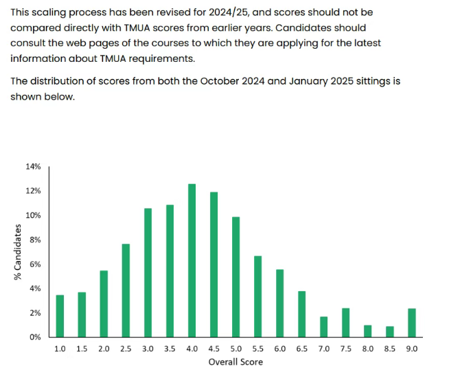 除华威大学和杜伦大学较为明确地提出了TMUA需要达到6.5分以上的要求外,其他学校并没有对TMUA的分数做出要求。根据UAT UK(英国本科生入学考试中心)发布的最新TMUA得分情况分布统计来看,如果你的目标是剑桥或IC,TMUA要达到7.5分及以上才有竞争力。