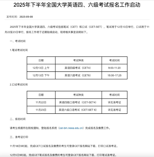 中国教育考试官网正式发布通知,2025年下半年全国大学英语四、六级考试报名工作全面启动!本次考试依旧分为**笔试(CET)和口试(CET-SET)**两部分: