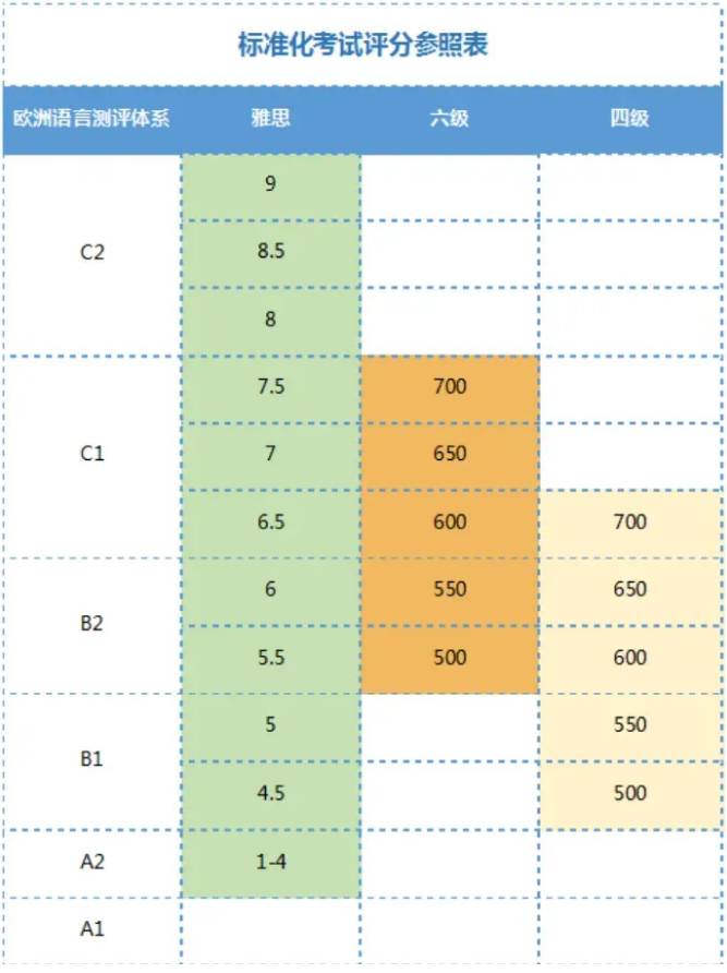 四六级与雅思的分数转换并非一一对应,但可以通过大致的对应关系来了解自己的水平。参考CEFR(欧洲语言共同参考框架)这套国际公认的语言能力标准: