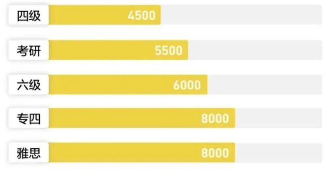 从词汇量来说,四级考试所需的词汇量是最少的,而且基本很多词在高中时就已经有所积累。但雅思考试想要考到高分,7000-8000词汇量不能少。