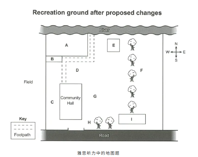 除此之外,雅思听力还有一大杀手锏,就是地图题,这类题型需要考生辨别不同地点和方位,主要也是为了应对海外留学和生活中需要面对的实际情况而设。