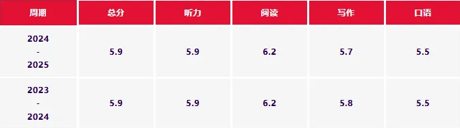 根据雅思官方发布的数据,2024-2025年度,中国大陆学术类雅思考生成绩,考生总分均分为5.9分,与上一年度基本持平。