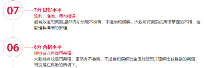 共8个等级分为A-H,最高等级为A级,要求总分7.5分,单项成绩不低于7.0分。最低等级为H级,要求总分6.5分,单项成绩不低于6.0分。