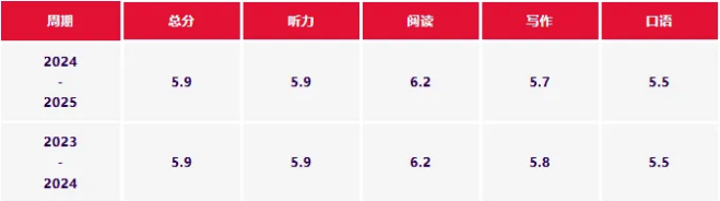 根据雅思官方发布的数据,2024-2025年度,中国大陆学术类雅思考生成绩,考生总分均分为5.9分,与上一年度基本持平。