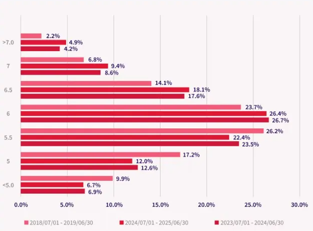 *图表:雅思学术类成绩各分数梯队分布(数据来源:英国文化教育协会中国大陆地区学术类雅思考生成绩大数据,统计周期:2024年7月1日至2025年6月30日,2023年7月1日至2024年6月30日,2018年7月1日至2019年6月30日)