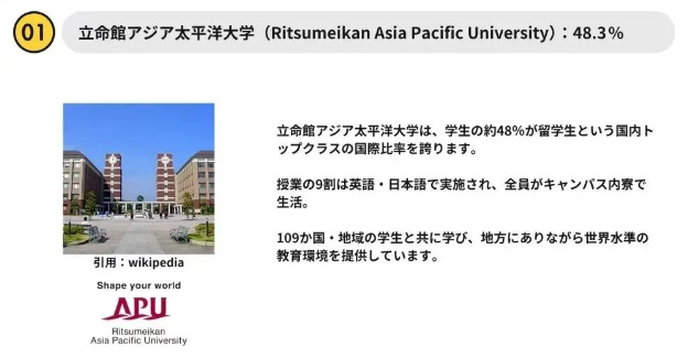 立命馆亚洲太平洋大学(APU)位于大分县别府市,拥有来自109个国家和地区的多样化学生群体,国际学生比例高达48.3%,在全校6,541名学生中,有3,160名来自海外。