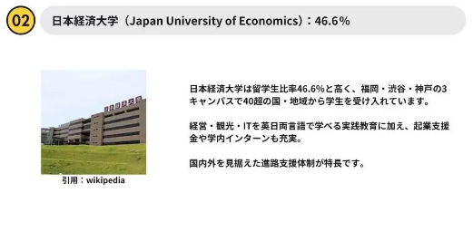日本经济大学在福冈、涩谷和神户分别设有校区,现有在校生5,741人,其中留学生2,675人,占比达46.6%。该校学生来自40多个国家和地区,其中以亚洲地区学生为主。