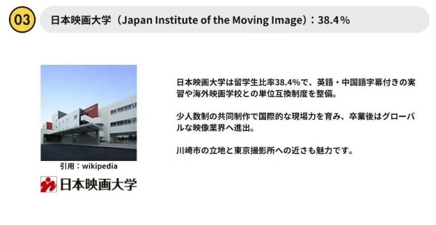 该校以电影制作专业见长,目前共有450名在校生,其中国际学生173人,占比38.4%。所有实践类课程均配备英文字幕和中文字幕,并与北京电影学院、美国电影学院(AFI)等国际知名院校建立了学分互认机制。