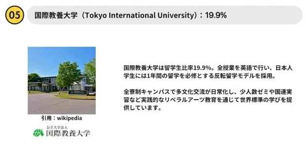 国际教养大学位于秋田县,现有在校生859人,其中留学生171人(占比19.9%)。所有课程均以英语授课,该校的特色是“反向留学”模式,即要求日本学生出国留学一年。