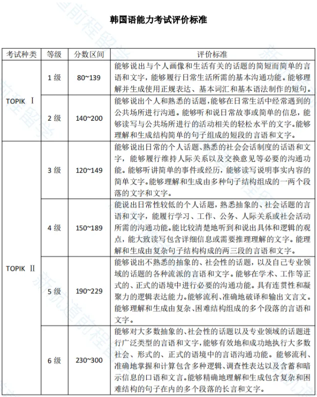 很多刚接触TOPIK的同学,还不了解各等级大概是什么水平下图是官方对各个级别基本要求的说明,可做参考~