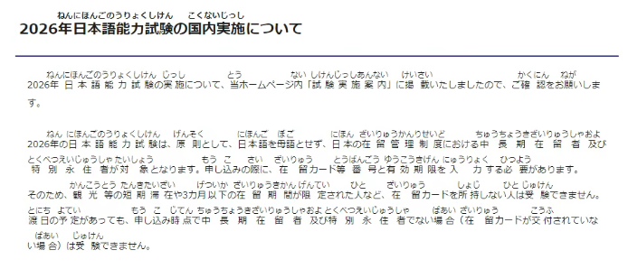 关于2026年日本语能力测试(JLPT)的实施,相关信息已刊登于本网站内的“考试实施指南”栏目,敬请查阅。