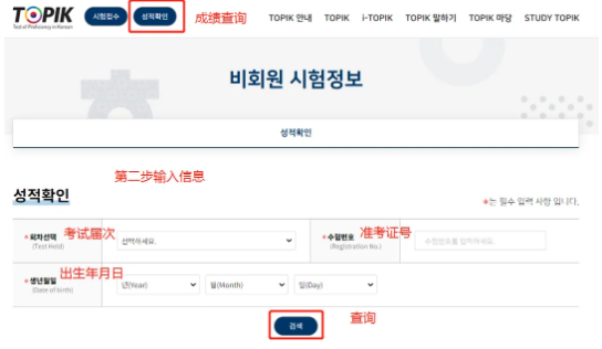 非登录查询:[성적확인] > 회차, 수험번호, 생년월일 입력 후 > 검색