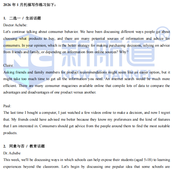 本文为新航道长沙学校托福教研组整理新航道2026年1月托福写作考试分析。每场考试结束后,新航道托福老师及时推送本场考试的完整版考题回忆和解析。可关注新航道长沙学校官方网站http://cs.xhd.cn,雅思分析、托福分析栏目将及时更新,帮助小伙伴们更好的备战雅思托福!
