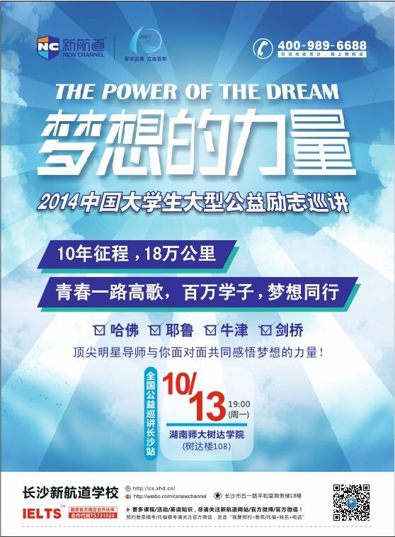 此次校园巡回讲座是长沙新航道2014诚意回馈新老学员之举,由新航道菁英李晓璐主讲,覆盖整个长沙地区所有高校,湖湘其他地区的巡回演讲活动也会在后续展开,欢迎广大同学踊跃报名参加!