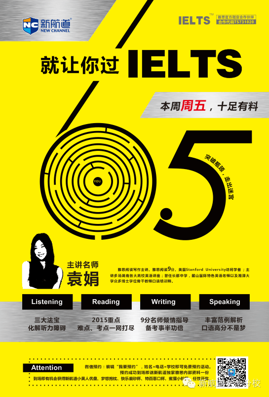 秉承“学术品质,立志百年”的新航道精神,特邀新航道精英&国际外教,针对雅思、托福、SAT、AP等出国留学考试开展主题讲座,长沙新航道现面向社会全体学员倾力打造的微讲座课堂正式落户书院九号!周五晚七点半为大家倾情带来长期免费微讲座!